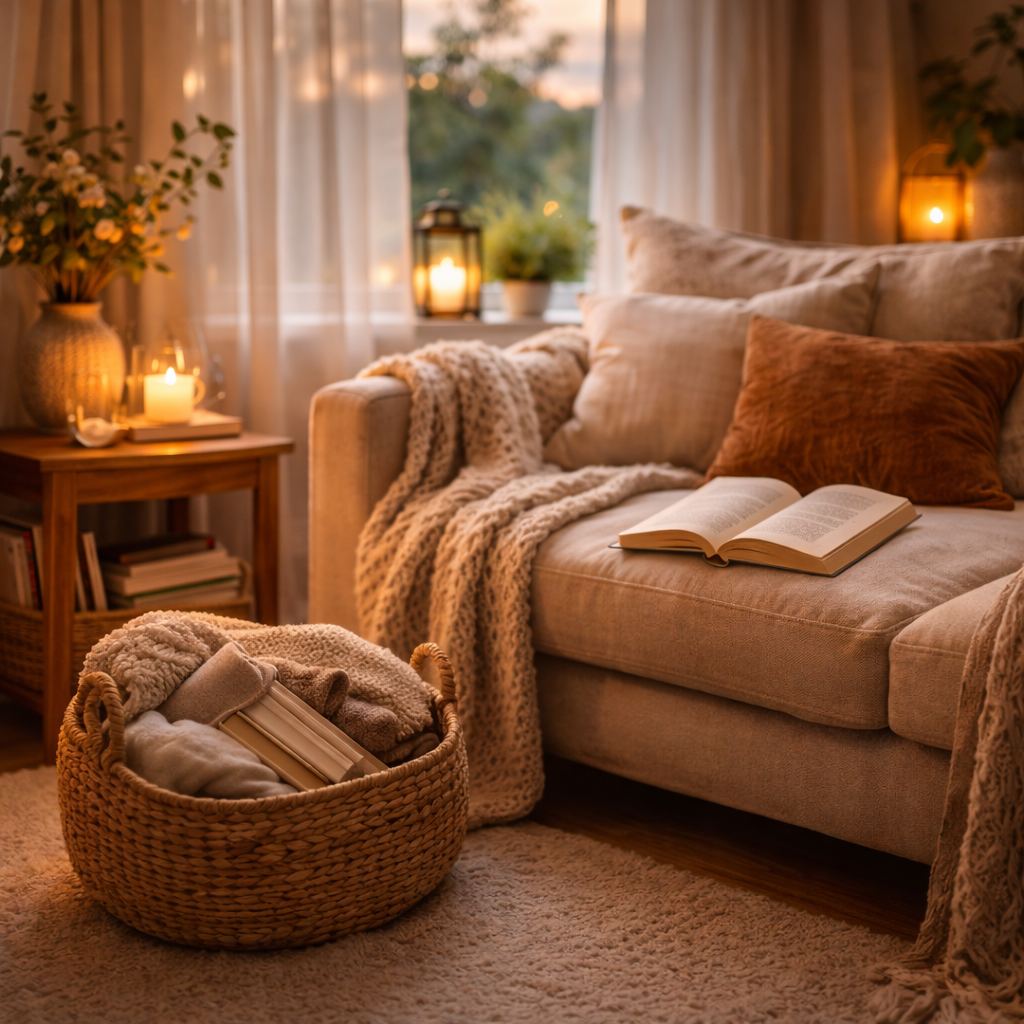 Tekstil adalah elemen pertama yang bisa diubah. Selimut rajut, tirai lembut, atau sarung bantal dengan tekstur alami dapat langsung memberi kesan lebih hangat.